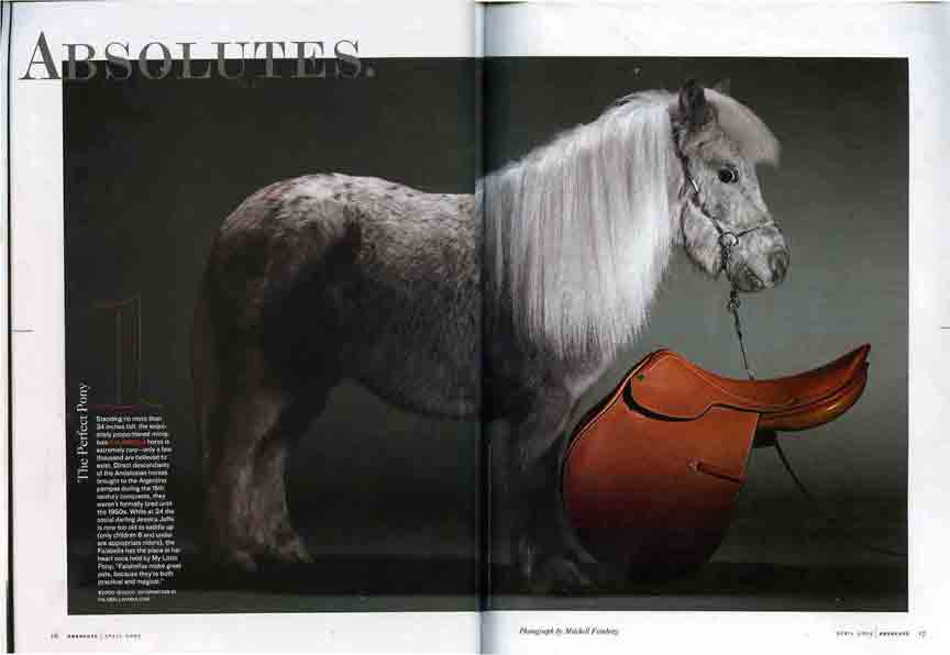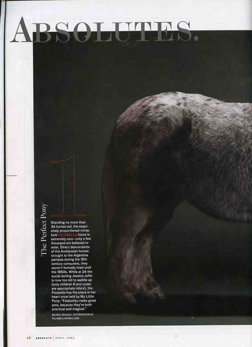 ABSOLUTE MAGAZINE! A MAGAZINE POSSESSING PRODUCTS ONLY OF THE HIGHEST QUALITY. THE MAGAZINE HOLDS HIGH STANDARDS, AND IS WELL RESPECTED. THIS MAGAZINE ADVERTISES IT ALL, ONLY THE FINEST, THE SKYS THE LIMIT AND MONEY IS NO OBJECT. DIAMONDS, RUBYS, FUR COATS, EXPENSIVE CARS, AND NOW FALABELLA MINIATURE HORSES!!!! WHEN ABSOLUTE MAGAZINE CONTACTED FMHA STATING THAT THEY WANTED TO INCLUDE THE FALABELLA HORSE IN THEIR MAGAZINE, WE WERE VERY PLEASED SO READ ON AND ENJOY!.............